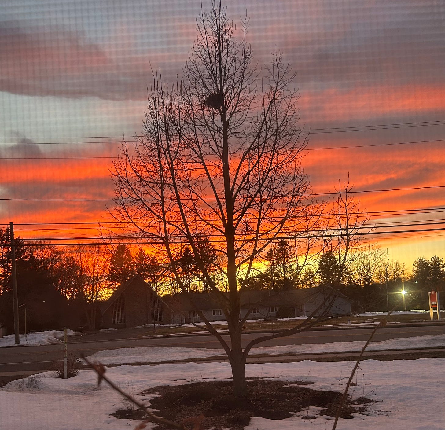 Right now, as I write, the sun is streaming in the kitchen window, and beaming straight through to the dining room where it is shining golden on a pot of blooming daffodils. Such simple beauty makes me catch my breath. Last night, the sky was a gardener’s delight; all orange and purple-gray as the sun set to the southwest as it does at this time of year. It made me rise and run to the window to take this photo to share with all of you this morning. (Apologies for taking this through a window screen. I am now rolling my eyes at myself for that.)