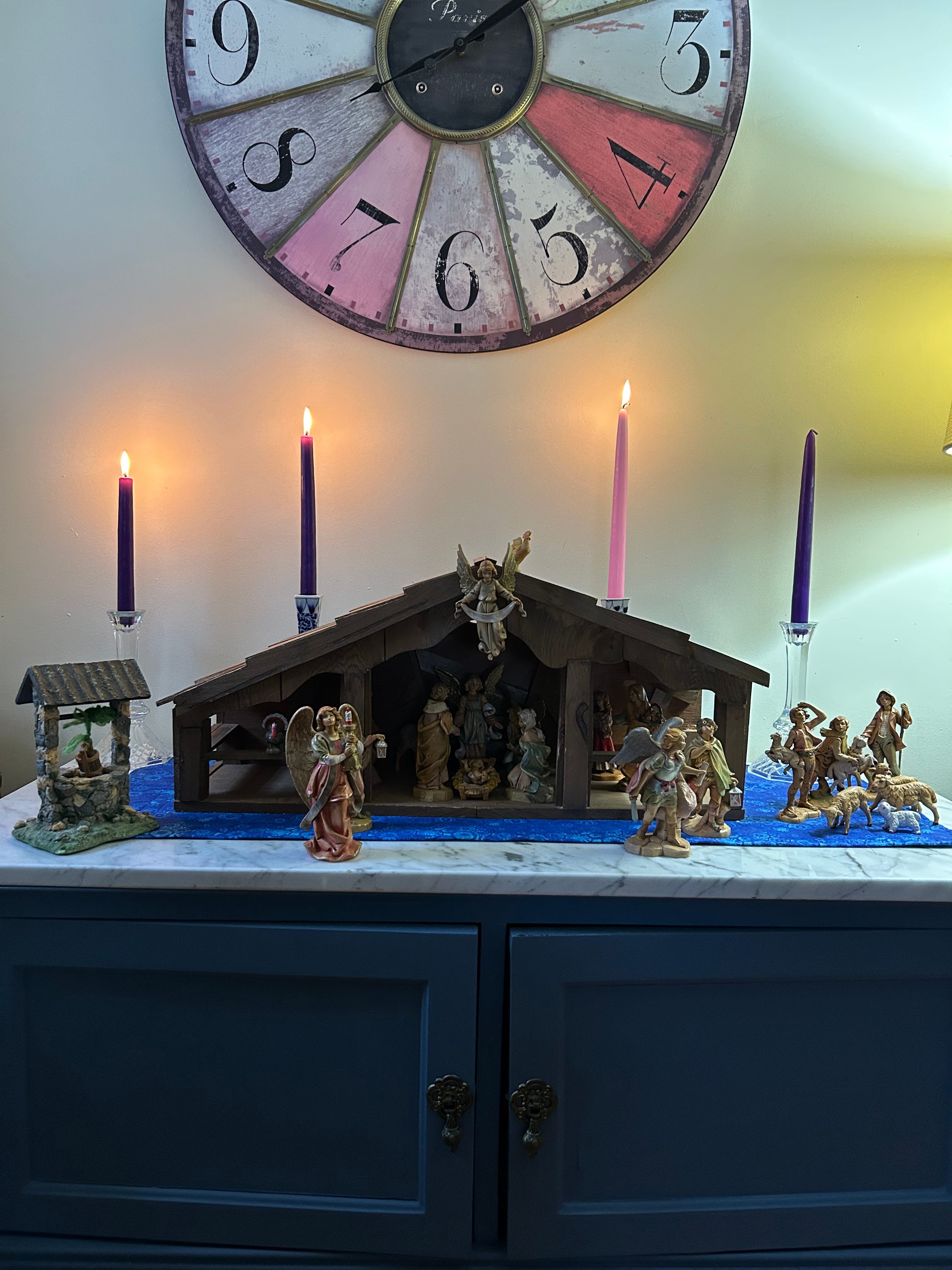 Today is the third Sunday in Advent; I will be lighting the pink candle, the candle symbolizing love. It will burn, with its sisters, hope and peace, on the table with the nativity scene so thoughtfully constructed by Granddaughter, and then partially deconstructed by one of the two-year-old twins last week. The candles will glow within my sight as I roast the last pumpkin for pumpkin bread and make some Christmas cookies to ship, share, and save for our Christmas Eve celebration.